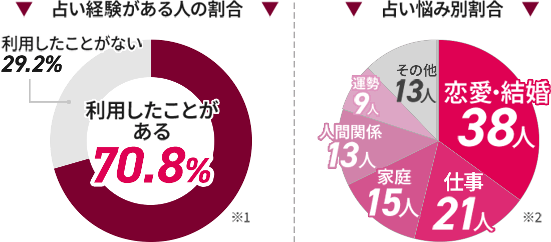 下記グラフの通り、2025年のアンケート調査では全体の約7割以上の方が「占いを利用したことがある」と回答。また、占い相談の中心は圧倒的に恋愛・結婚で、ほかの悩みを大きく上回っていることがよくわかりますね。