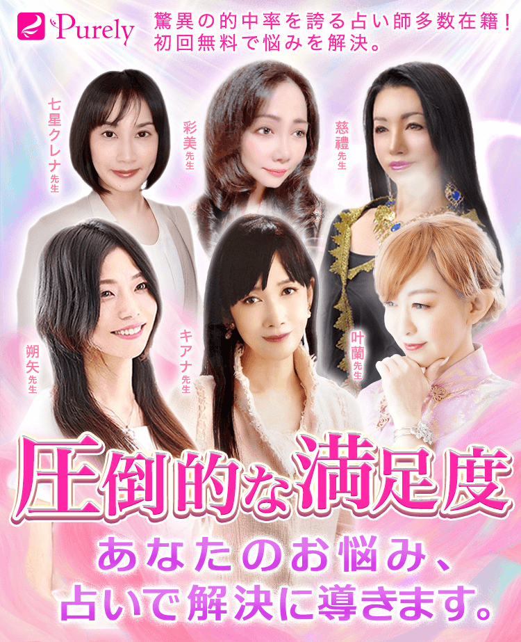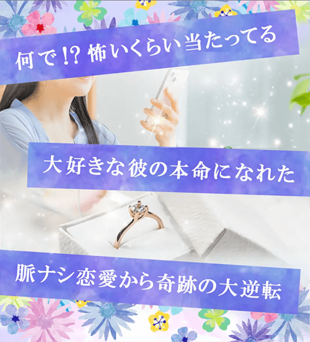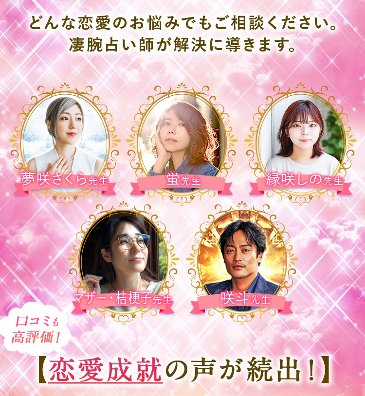 在籍占い師は60名以上。霊感霊視、タロット、四柱推命、西洋占星術など占術も幅広く、SNSやメディアで話題の実力派が揃っています。中でも復縁・縁結び・不倫・略奪愛といった複雑な恋愛相談に強い占い師が多く、的中率の高さも口コミで高評価。
