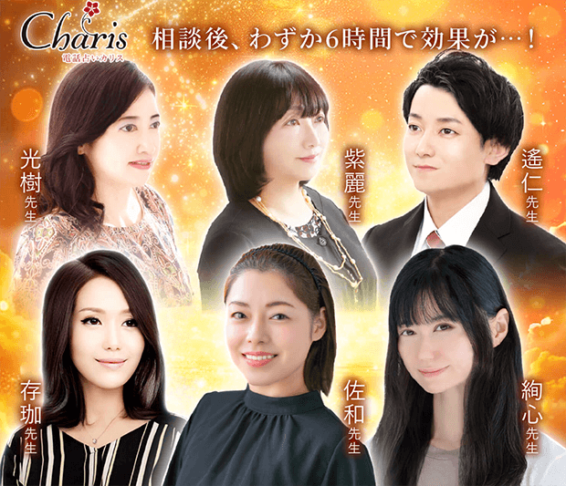 カリス全体では特に「復縁」に強い占い師が多く、鑑定満足度や専門性、独自性にも徹底してこだわりぶり。霊感・霊視、チャネリング、霊感タロットなどスピリチュアル系占術を得意とする先生が多く、恋愛はもちろん、仕事や人間関係、家庭問題まで幅広く対応。