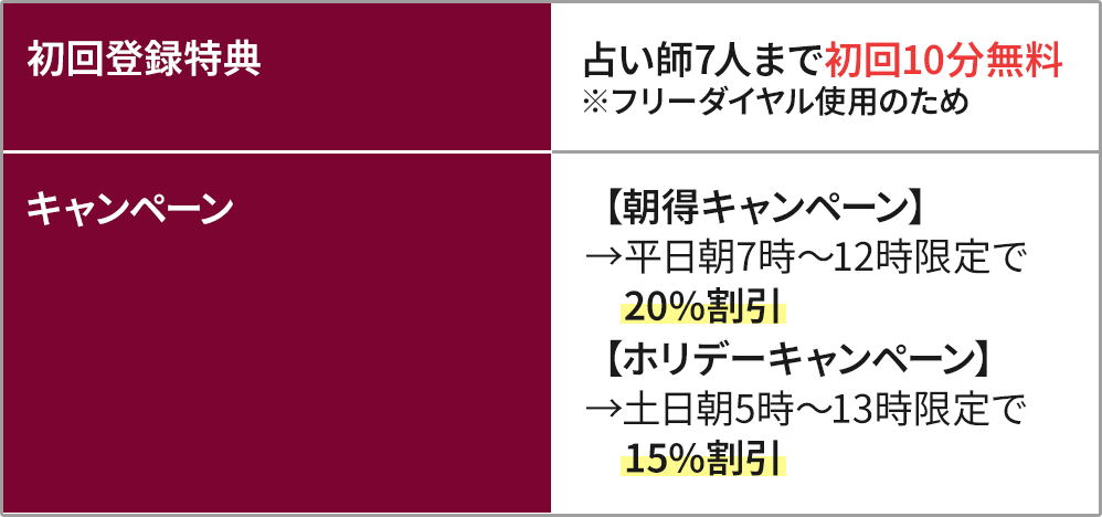 - 初回10分無料の特典を「最大5人の占い師」まで使える
