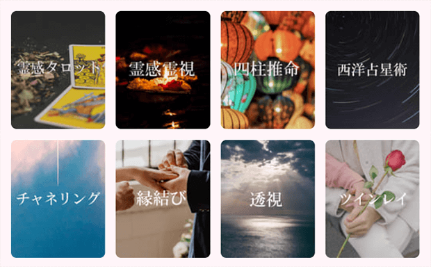 霊感・霊視・タロットをはじめ、四柱推命、西洋占星術、風水、チャネリング、オリジナル占術まで幅広く対応。復縁や複雑愛など人に相談しにくい悩みに強い占い師が多く、「占い師による当たり外れが少ない」「どの先生でも満足度が高い」と口コミ評価も上々です!