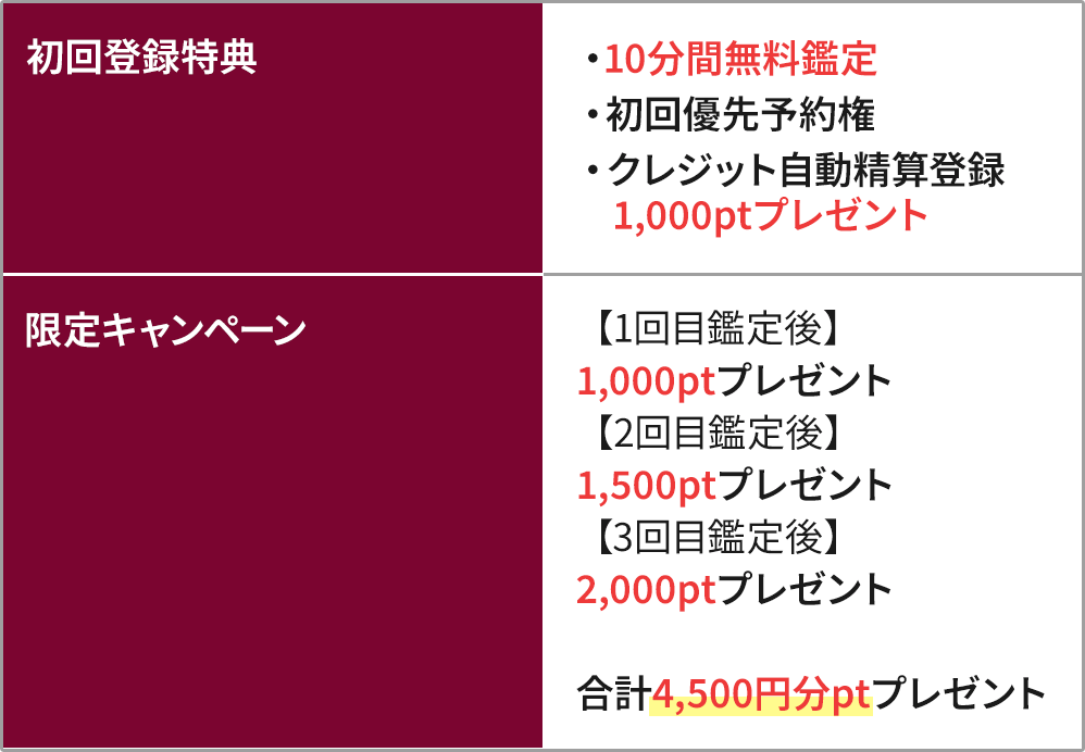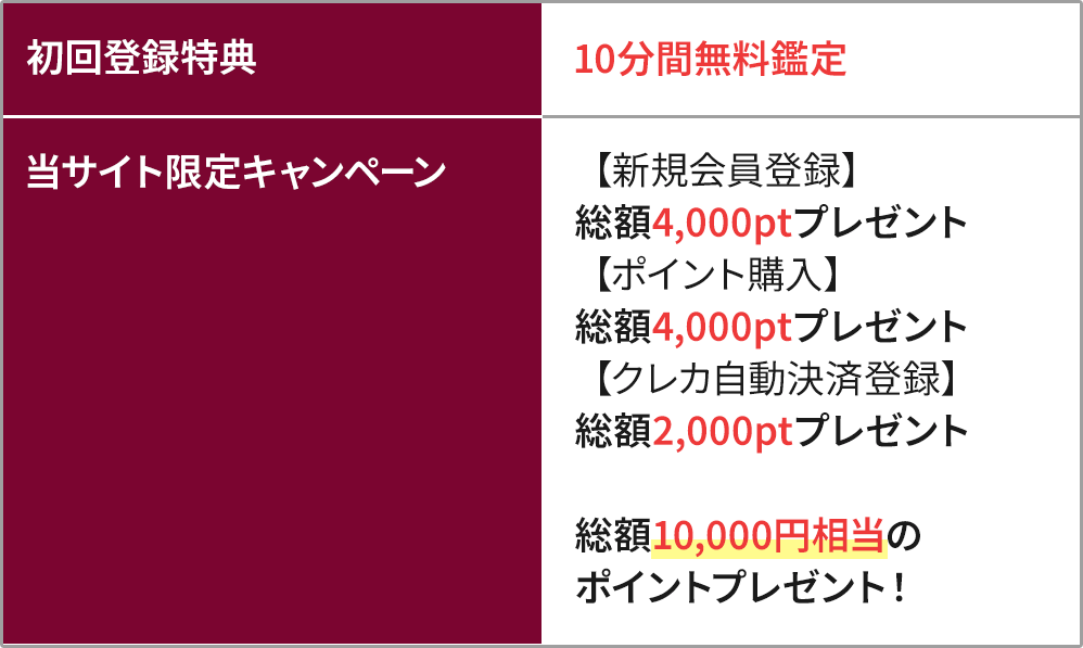 無料会員登録を完了するだけで自動的に2,600円分の無料ポイントが付与されるため、特にポイント申請の手続きは必要はなく、登録後すぐお得に鑑定をスタートできます!