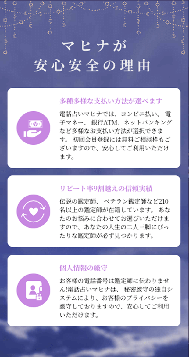 運営元は大手通信会社の子会社である株式会社ティファレトで、安定した運営基盤とセキュリティやシステム面の信頼性も高いため、電話占い初心者〜上級者まで幅広く人気です。