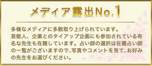 在籍する占い師は200名以上。テレビや雑誌で活躍する占い師や、的中率を競う番組『THE的中王』出演経験のある実力派が多数在籍していることでも知られています。