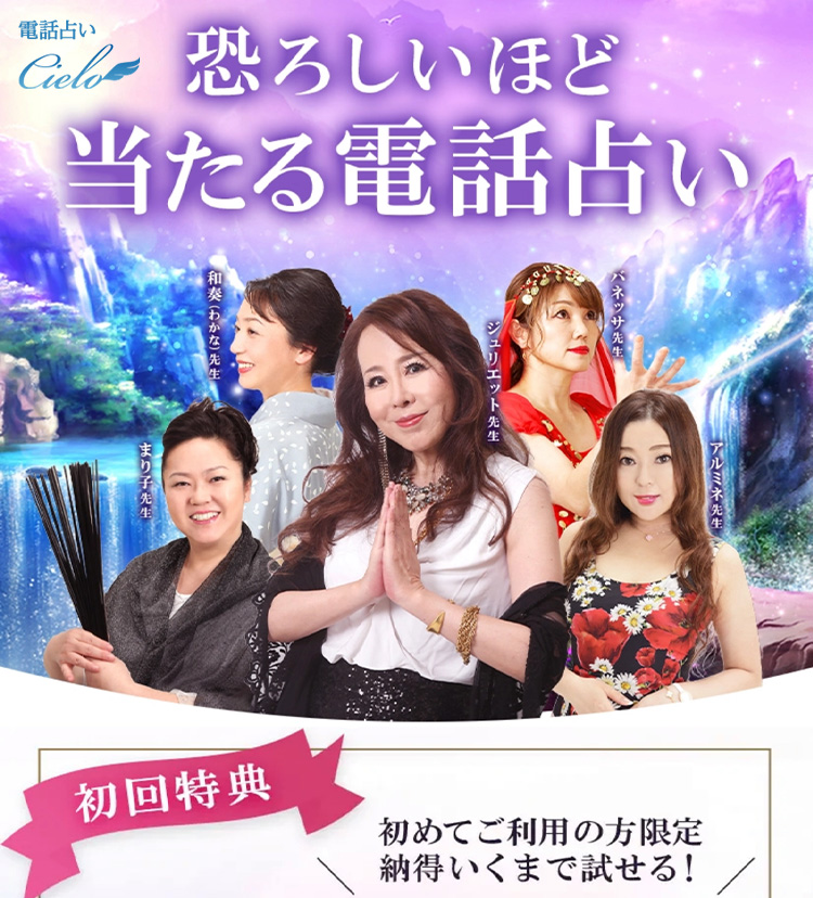 会員数150万人以上!メディアに出演している占い師も多数在籍している、電話占いシエロ。通常のサポートセンターだけでなく占いに対する質問を受け付け「コンシェルジュデスク」を完備していて初心者でも安心のサイトです。